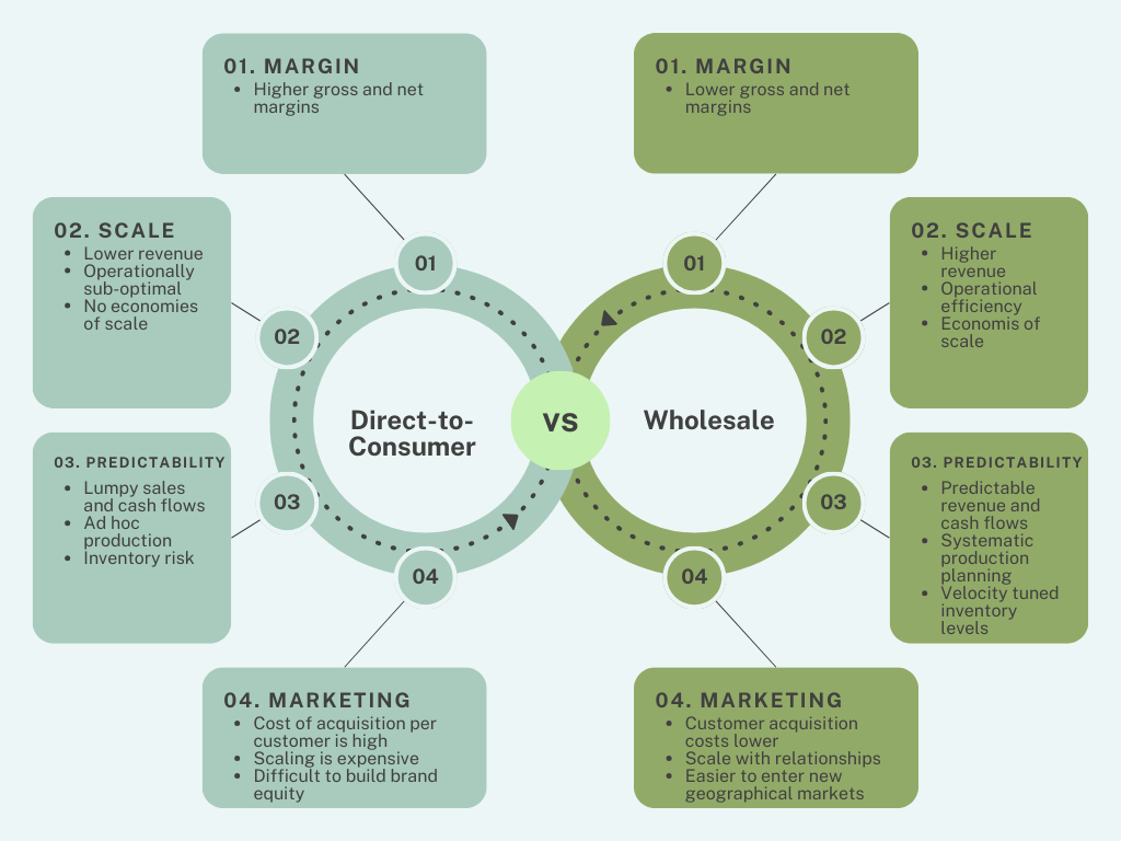 Introduction: The Channel Strategy Question Many small consumer products businesses start out selling direct to consumer. Once they establish themselves as a profitable enterprise, the next boost in growth is likely to come from wholesale and other channels. When and why to pivot from DTC to wholesale is critical to know. We will take a